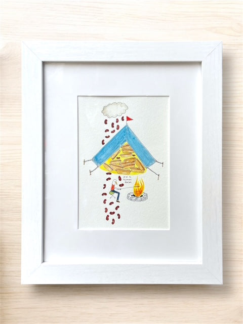 I'm a Human Bean is a quirky illustration that brings absurdist humor to life. The artwork depicts a whimsical campsite scene complete with a tent overflowing with hotdogs while a cloud above rains down beans—a playful take on the phrase "human bean." Perfect for anyone who appreciates surreal, offbeat art and wordplay. This piece celebrates the weird and wonderful side of creativity, making it an ideal addition to any space that values humor and imagination.