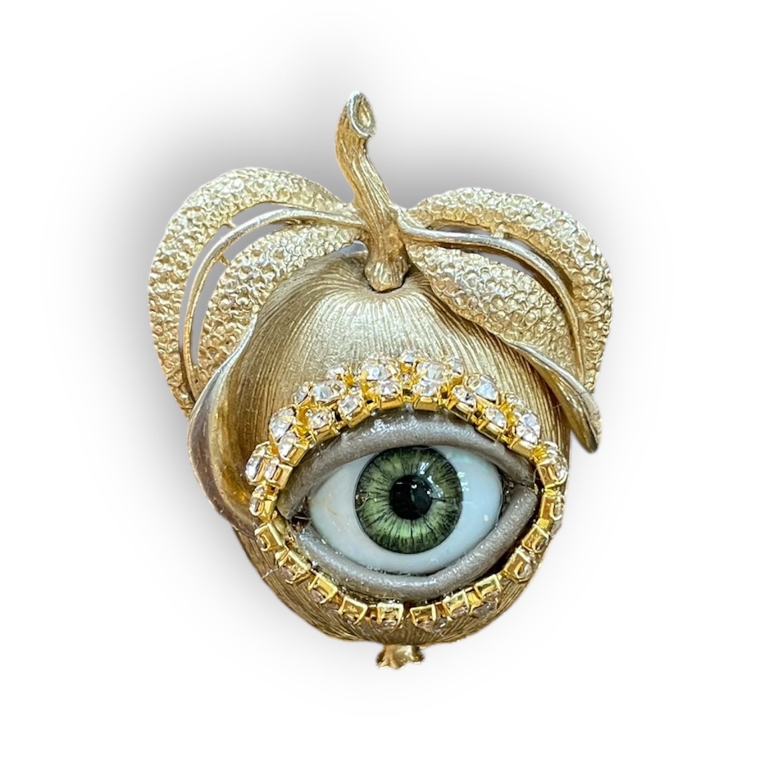 This Apple of my Eye Pin is a one-of-a-kind creation by GardenWinks, who sources vintage treasures and brings them to life with playful, hand-applied eyes. These whimsical brooches blend nostalgia with personality—perfect for adding character to jackets, bags, or lapels. Every pin tells a story, combining the charm of found objects with imaginative artistry. Wear a piece of quirky, handmade magic.