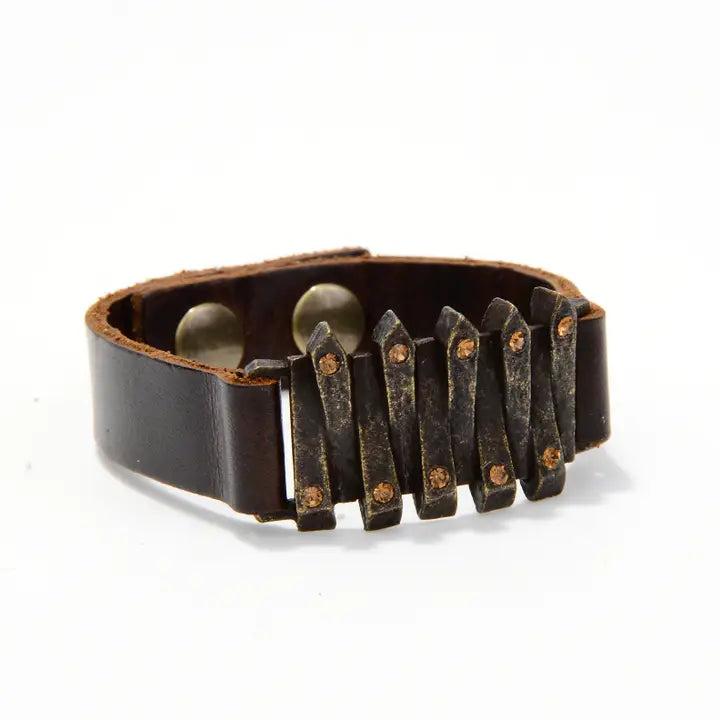 Rebel interlocked metal bar with crystal tips leather bracelet. Antique brass finish with Austrian crystals. Genuine Italian leather with adjustable snap closure. Handcrafted in Brooklyn.