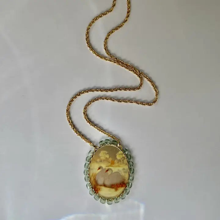 The Swan Necklace is truly unique! It features a vintage decal from Germany applied on a mirror that creates a stunning, matte finish. Adorned with faceted green glass beads, this necklace is incredibly beautiful.